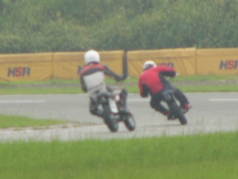 でも、 転ばない作戦の私でしたが、そのうちやっぱり、「もうちょっとイケるんじゃないか?ビビるなビビるな」と少しづつ気持ちも熱くなって自然とペースアップ。そのたびに滑ってヒヤヒヤすることも多くなってきました。一番危なかったのは、コース最大のコーナーでプチコースアウト。今日はこの雨でシケインが設定されていませんでしたので、このコーナーのスピードが乗りに乗ります。途中まではセーブしていたんですが、全開にしたところ曲がれなくなりました。倒しこむと転びそうで、やむなくコース外への誘導路へ退避。それからコースに戻りました。危ない危ない。